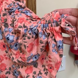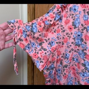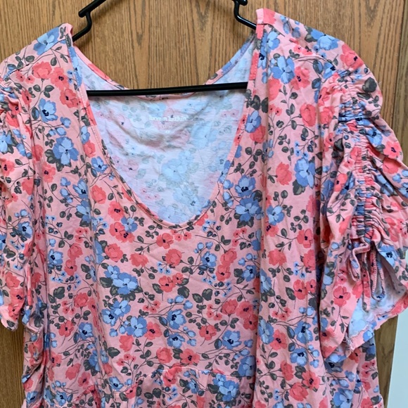 Short sleeved shirt. Sleeve length can be adjusted with laces. Peachy color with flowers. 34/36 4x. 60% Cotton/ 40% Rayon
