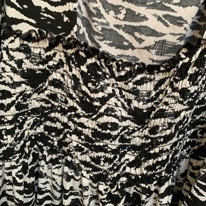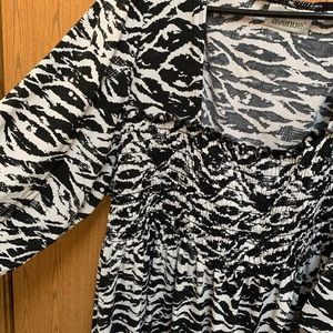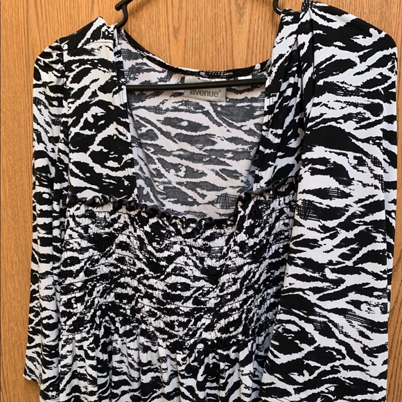 Top with 3/4 length sleeves. White/Black print. Size 26/28. 92% polyester/8% spandex