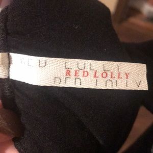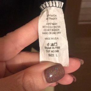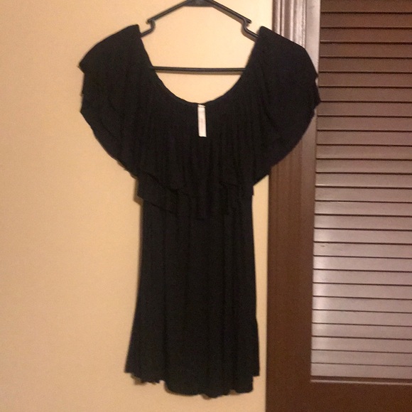 Black top with ruffled neckline and sleeves. Size large but is slightly fitted and fits more like a medium. Can be worn on or off the shoulder. Never worn- intended for a cruise and didn’t take with me.