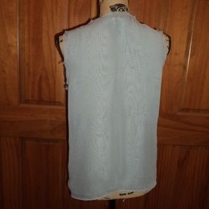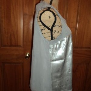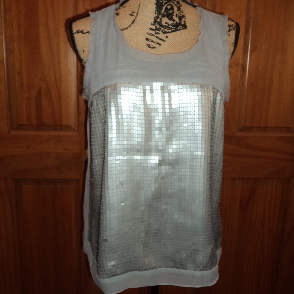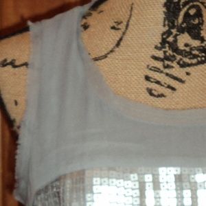 Grey/Silver sleeves tank top/camisole. Top has square shaped sequined to add shine and pattern to front of top. Neckline and arm-holes have frayed look to material -- this is a design component and NOT due to wear.