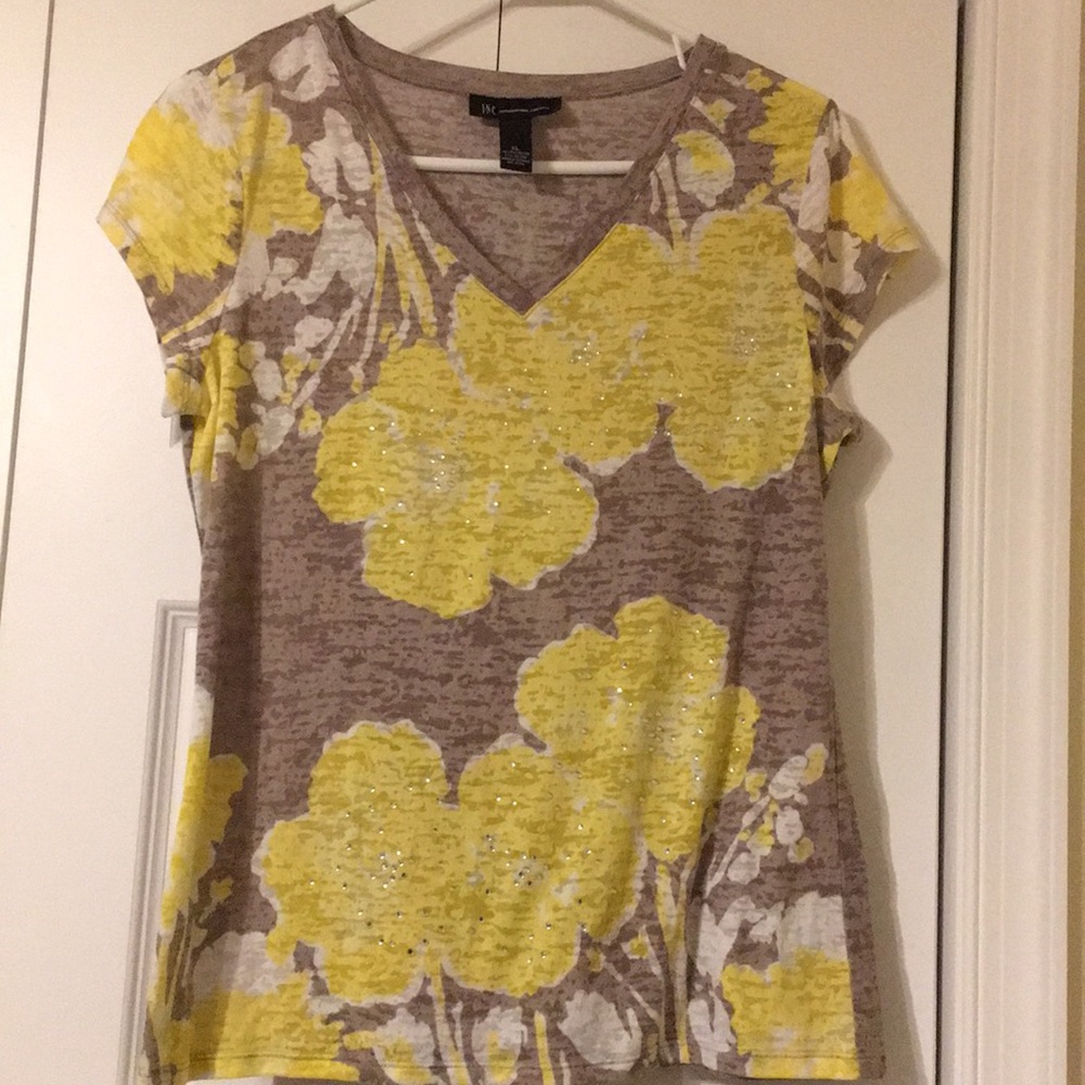 Summer top tan, yellow and white floral. Lightweight material. Has bling on front of shirt.