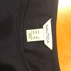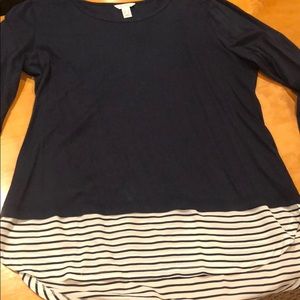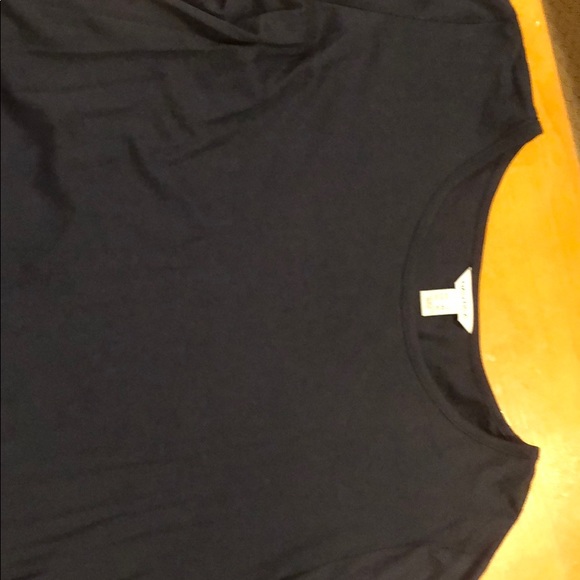 Navy t-shirt fabric up top with a flowy blouse like bottom. Like new. Cute with jeans.