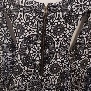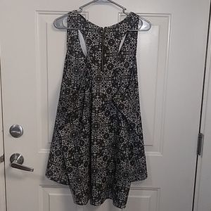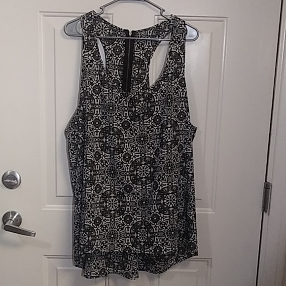 Black and white sleeveless top. Its a little longer in the back. Chest is 52 inches and length 34 inches