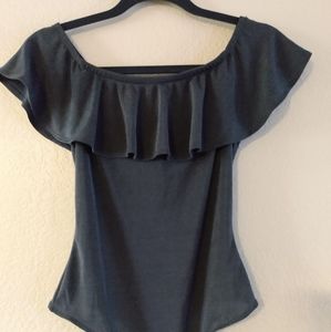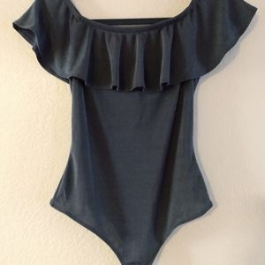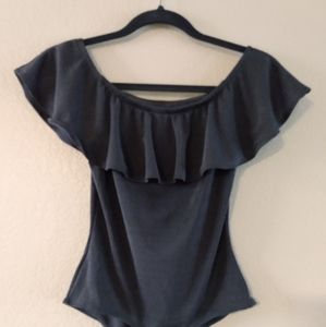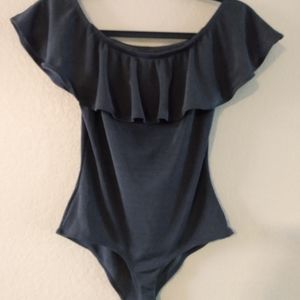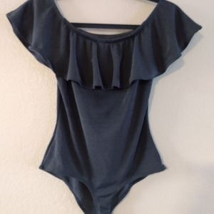Super cute, blue metallic body suit by Iris, that exposes the shoulders. Measurements: torso 12in Width 13in. Although this is a medium in size if you're petite it fits like a large.
