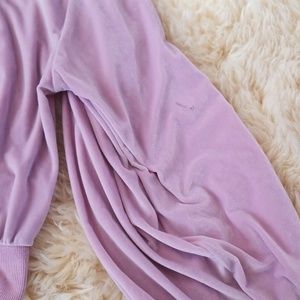 Very pretty long sleeved cropped velour sweater! Only wore a couple times, in very good condition. However it is missing the ribbon that ties the sleeves up. This is shown in picture 4 and 5. You could easily put whatever sort of ribbon you wanted through the holes, I never used the ribbon and you couldn't tell one bit! Size XS but definitely could fit a small or medium!
