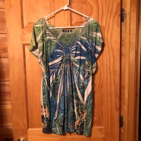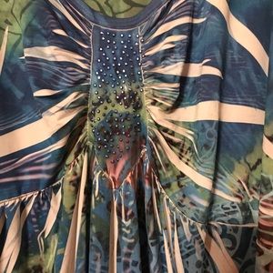 Super cute multi colored tunic 96% polyester 4% spandex super flow he and has some jams at the neckline