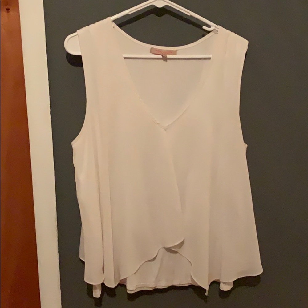 White top, tank sleeves, thick shirt material underneath and blouse material on top. V neck.