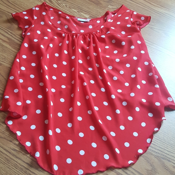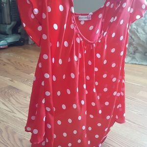 Red with white polka dots, light flowy material open at the lower back overlaps shoulder blades