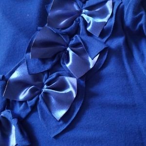 Blue top with satin bows. Stretch.. great for Christmas and very comfortable.