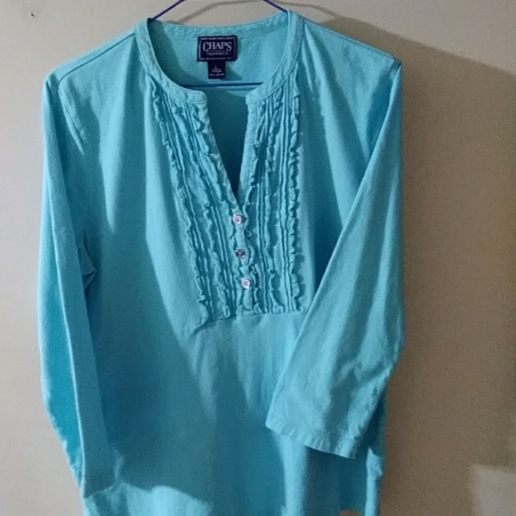 Aqua pullover top, 100% cotton, ruffled yoke, 3 silver buttons