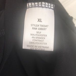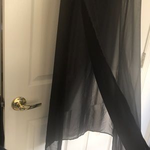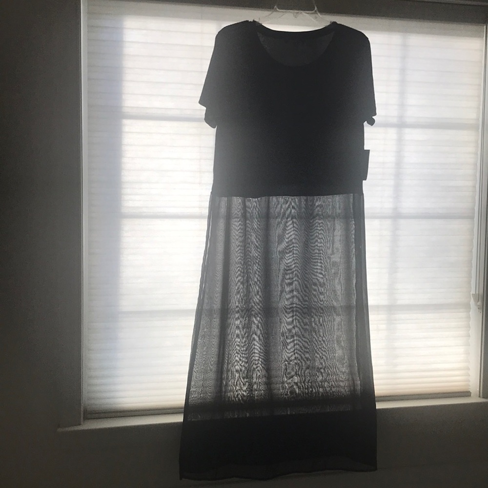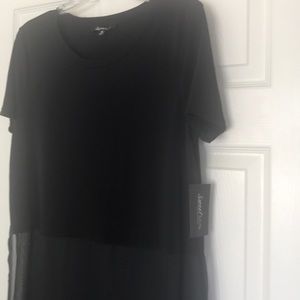 NWT black short sleeved top with long sheer bottom. Solid black goes appx 18” from shoulder to start of sheer section. Sheer section is appx 31” long. Side slit up to the solid part. Great look with leggings. Measurement across bust is appx 20”. Nice stretch material.