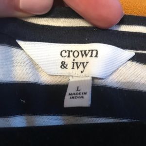 Navy and white striped long sleeve shirt. Beading detail around the neck. Chambray bottom. Comes down longer in the back than the front. Worn a couple of times
