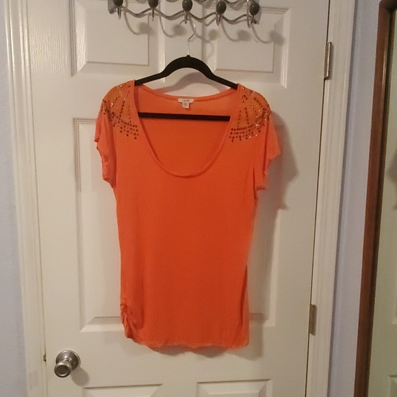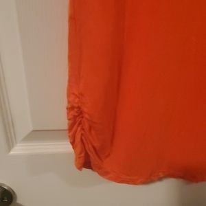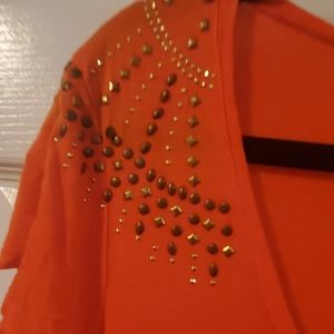 Comfy orange top with gold/brass details. Gathered on right side 100% rayon material