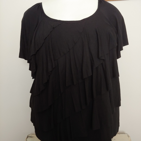 Black front ruffled top. Short sleeves. 95% rayon 5% spandex 27 in long 25 in across bust. NWT no pets non smoking home