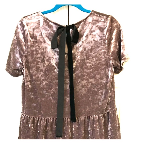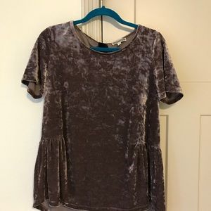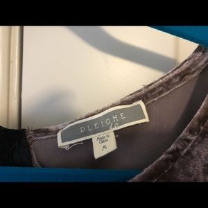 Crushed velvet top with black tie closure in back. Loose fit but very flattering. Interesting color - silver with a bit of blush.