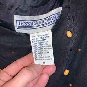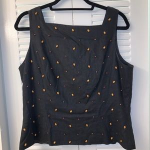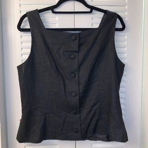 Black linen, lined tank top with light and dark colored wooden beads on the front and large black buttons on the back.