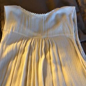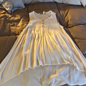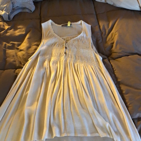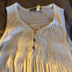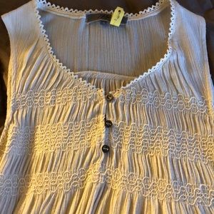 Newly laundered at cleaners. 100% rayon. Hand wash cold. Size small but can be worn as med, as I am size med. Comfy and can be worn under cardigan.