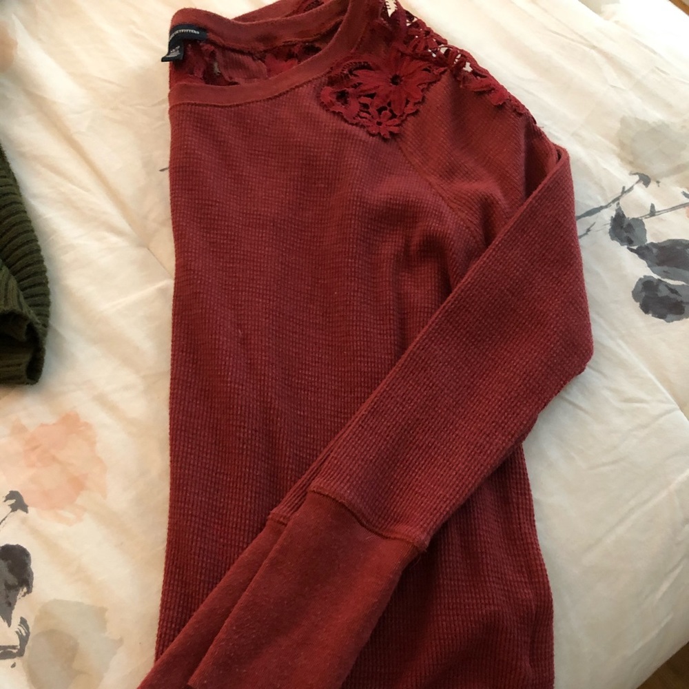 Red long sleeve shirt with flower design on the back