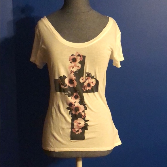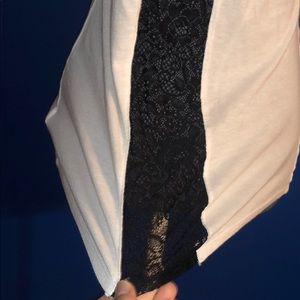 Small white short sleeved top with a floral cross in front and black lace straight down in back