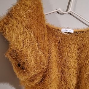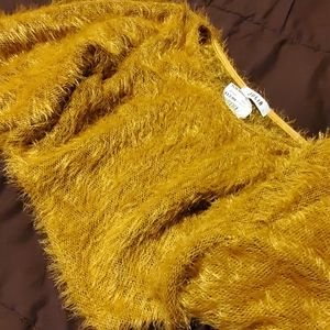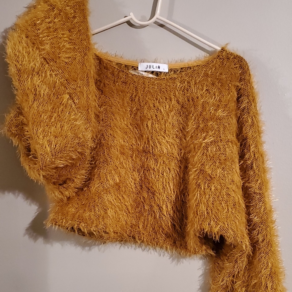 Fuzzy croptop, size large. It's a size large but can be worn by small & medium. Top is cropped with bell long sleeves & very stylish. It's 100% polyester. Great for parties, office or casual wear. Very comfortable & soft.