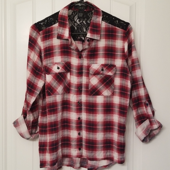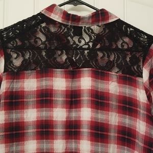 Lightweight, plaid, long sleeved, button down, lace shoulder, roll up sleeve w/button,