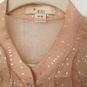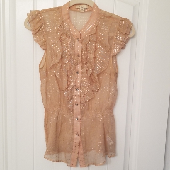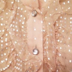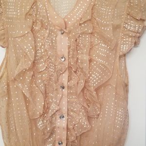 Sheer, ruffled short sleeves, diamond style buttons, elastic waist. Vintage looking