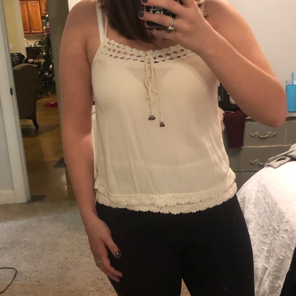 Cream/off white tanks top. Wayyyyy to small for me! Never worn. Lace detailing. Adjustable criss cross straps