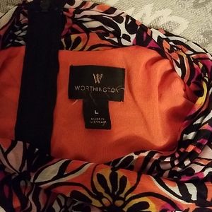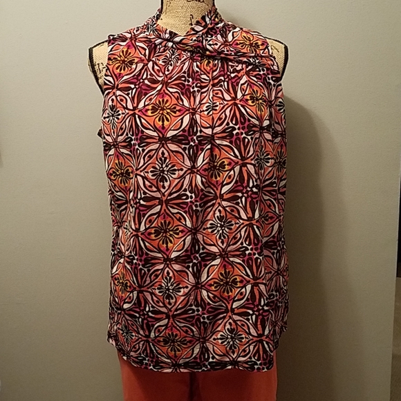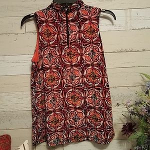 Sleeveless polyester top with a back zipper and a high neck. Fully lined. Beautiful orange yellow and brown print. Size large