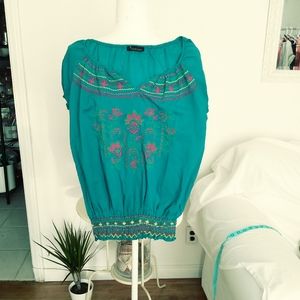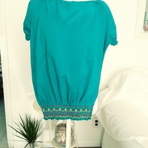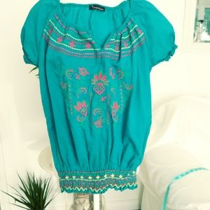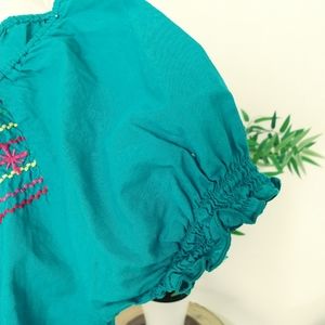 Cute blue embroidery top, 100% cotton size medium, elastic waistband and sleeves, pit to pit 21 in, Length 24 in, waist 22 in and stretches to 17 inches