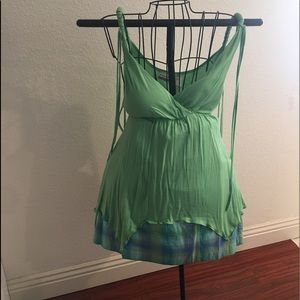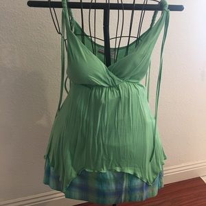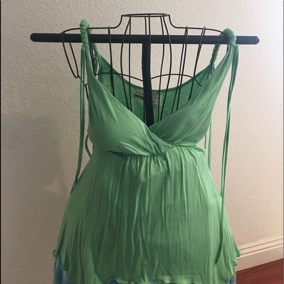 Rope strap top with tassels hanging front and back at shoulders. Padded bodice, pointed bottom with overlock threading to create a ruffling appearance. A whimsical fun top for the summer.