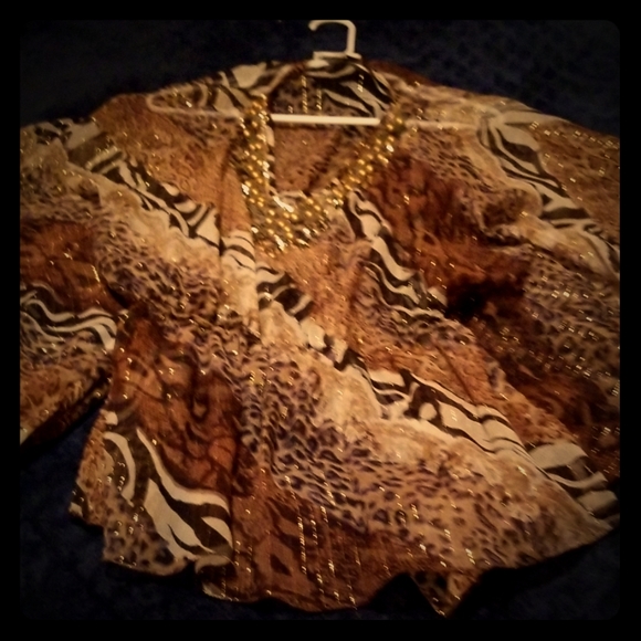 V Neck Leopard studed shiny Top around neck sheer, elastic waste. Would look good with black pants.