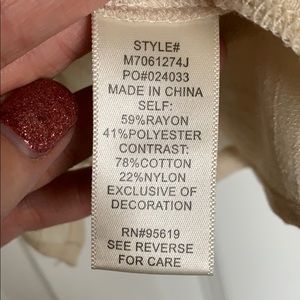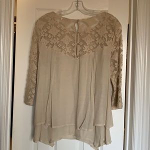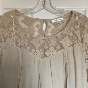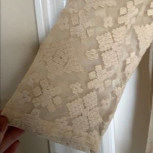 4 button keyhole back; layered hem; lace sleeves & chest/back; worn one time.