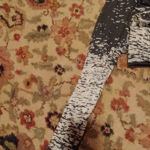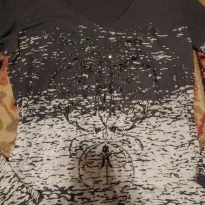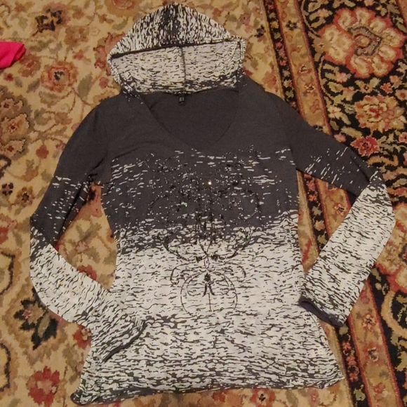 Long sleeve, v-neck, hooded thin shirt with black beaded design on front. Small stain on elbow but not very noticable other than that in good condition. XL but runs a little smaller.