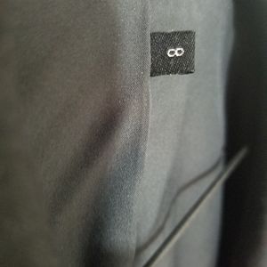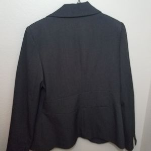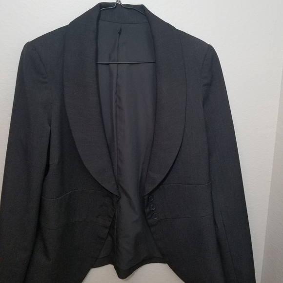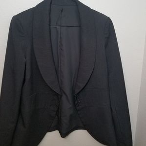 Charcoal gray blazer with round collar and cinched waist for a more feminine style