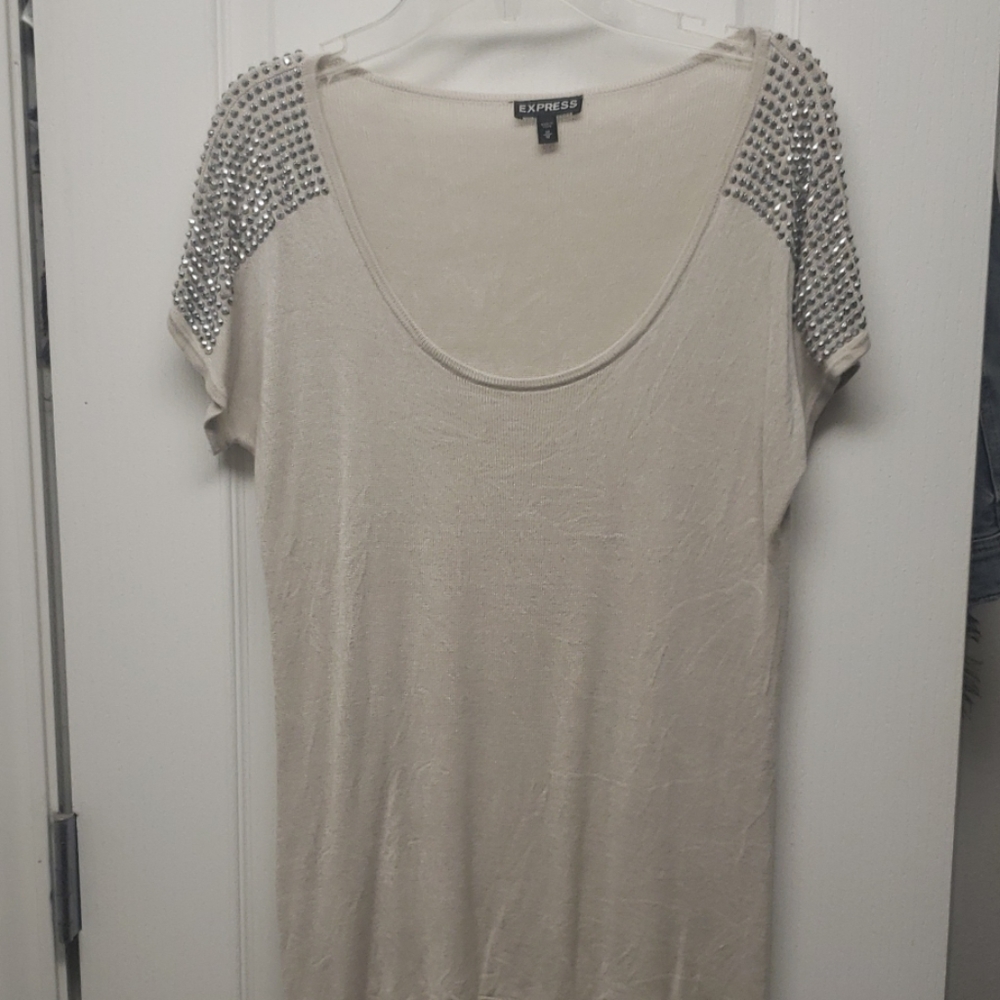 Cream colored top with silver beaded sleeves