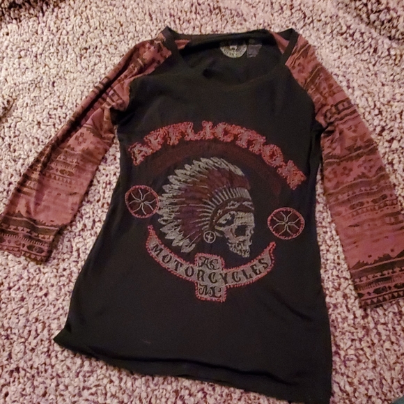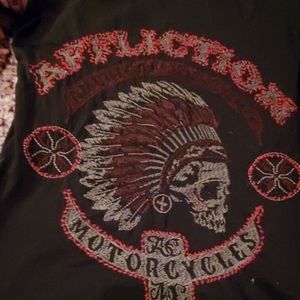 Adorable Affliction American Customs 3/4 length sleeves Black with brick color tribal sleeves. Indian skull on front and wording all hand embroidere with red , gray and brick thread ing.Excellent condition. Measures.underarm to underarm 17 inches. Shoulder to hem 25 inches.