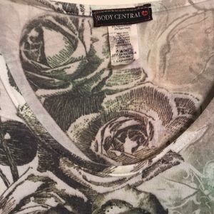 This body central top has creased shoulder with small studs on the flowers. Arm pit to arm pit is 14 in.