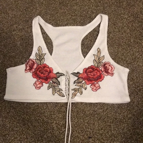 White crop top with red roses, strings to tighten the middle.