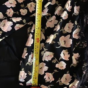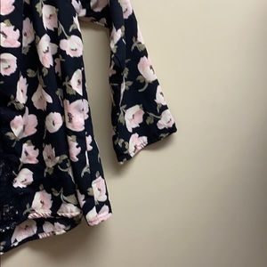Floral top with choker tie around the neck, one button. The sleeves come just past your elbows and the top comes below the belly button.
