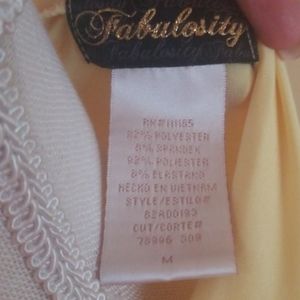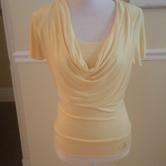 Soft yellow top. Draped front with second layer underneath. Capped short sleeves.form fitting.