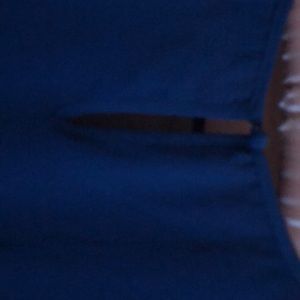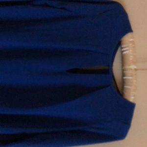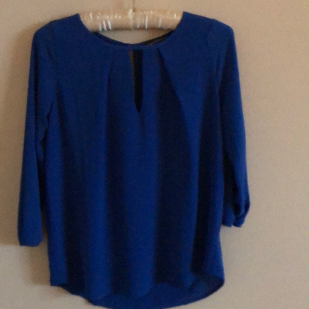 Royal blue light weight top. 100% polyester. Three quarter length sleeves. Keyhole and pleated detail at front neckline. Keyhole closure in back. Hits at hip.
