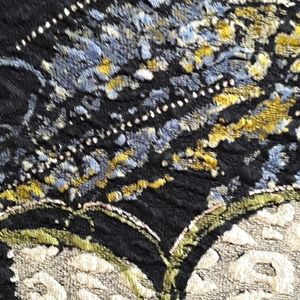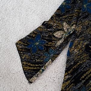Black/ blue/ gold print top with 3/4 " sleeves The gold has a shimmer. Great with black pants for a night out!!