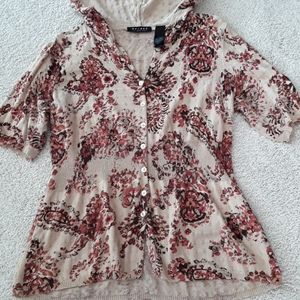 Tan & rust colored print button down front hooded sweater. So cute with jeans!! 🌻