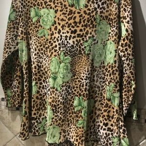 Crinkle top in a leopard print with green flowers. The top angles to the side. Great for traveling!