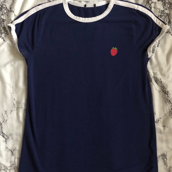 Navy blue top with a small strawberry design on the left breast, and white stripes running down shoulder to short sleeve collar, preowned condition