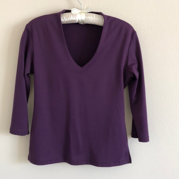 V-neck top. 3/4 length sleeves. 2 inch slits on either side. Hits just above the hip. Front bodice area is lined. Spandex and polyester.