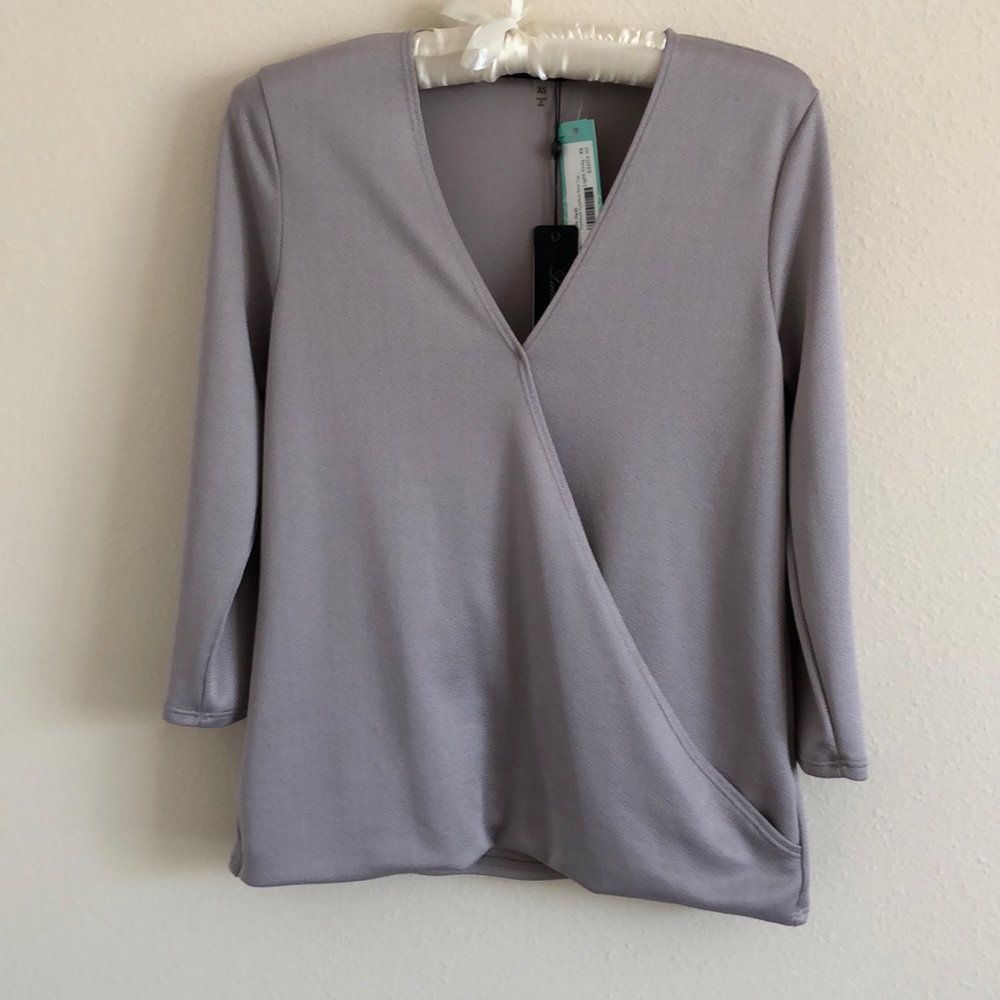 Pale gray surplice knit top. 3/4 length sleeves. Polyester and spandex. Never worn new with tags.