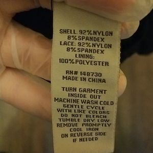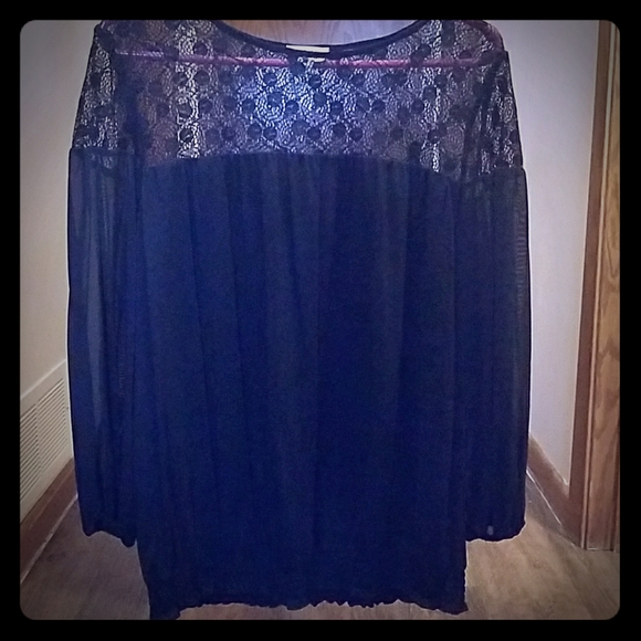 Eci New York sheer black pull over blouse with lace across the shoulders and chest.