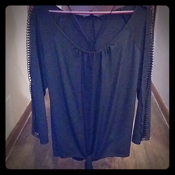 Relativity polyester tie front black top with netting down the sleeves.