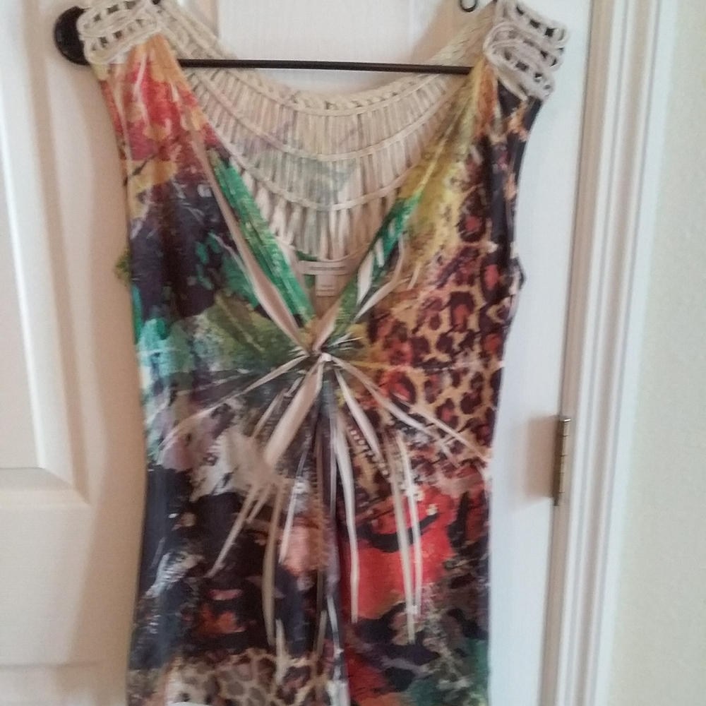 Colorful V-neck sleeveless top. Beautiful crochet look on shoulders and back. Soft and very lightweight and comfortable. I think it runs slightly smaller than a true medium. Worn once!